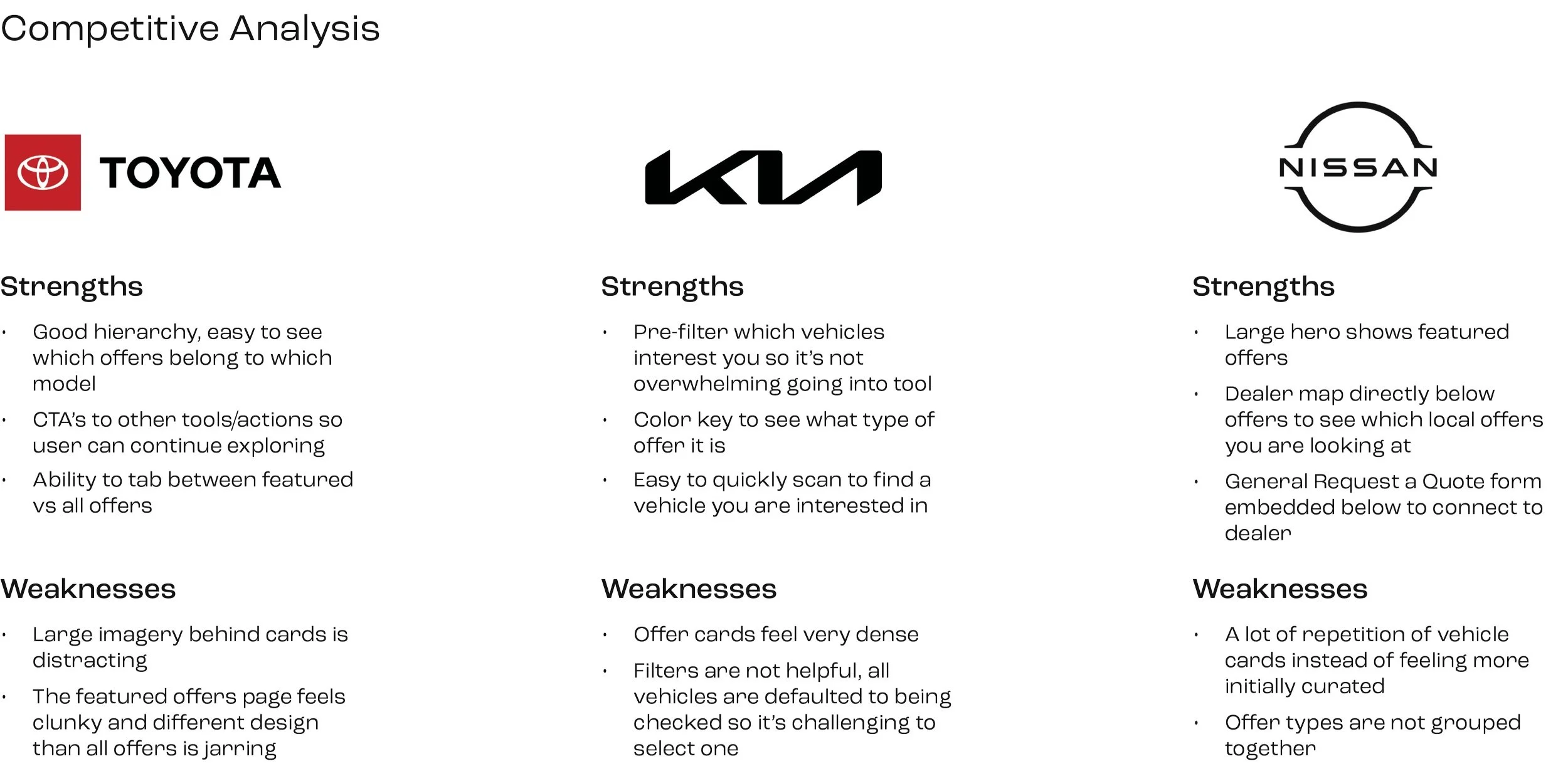 To begin this project, I conducted a competitive analysis on other automobile manufacturer’s Current Offers tools. I then turned to Honda’s Current Offers page to audit the experience so I could understanding the immediate pain points.